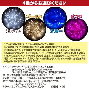●ソーラーパネルを壁面や手すり等に固定もできる仕様 夜を美しく演出するイルミネーションをご家庭でもカンタンにできるセットです。LEDを飾り付けて、ソーラーパネルを太陽光が良く当たる場所へ設置してご使用ください。ソーラーパネルは、付属の固定クサビを取り付けて、地面などに挿して立てるか、支柱にある二ヵ所の穴を使って、壁面やベランダ柵に市販のネジやハリ金等で固定することができます。明るさセンサーがパネル部分に内蔵されてますので、周囲が暗くなると自動で点灯します。周囲が明るくなると自動で消灯します。モードスイッチを押すと点灯・点滅のパターンが変わりますので、お好みで選択してください。常時点灯/じわっとホタル/派手にフラッシュ等と多彩に変化させることができます。